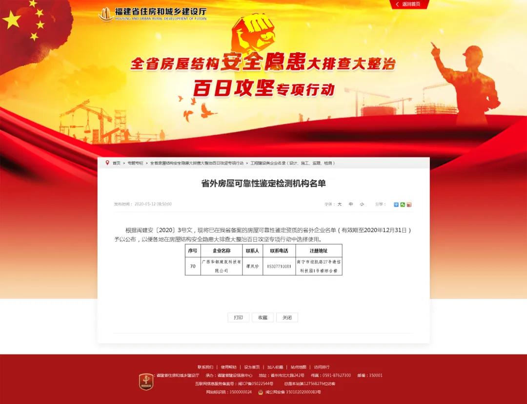 根據(jù)閩建安〔2020〕3號(hào)文,我司在福建省房屋結(jié)構(gòu)安全隱患大排查大整治百日攻堅(jiān)專項(xiàng)行動(dòng)中順利通過福建省住建廳的備案工作,現(xiàn)已取得福建省房屋可靠性鑒定資質(zhì)省外企業(yè)認(rèn)可