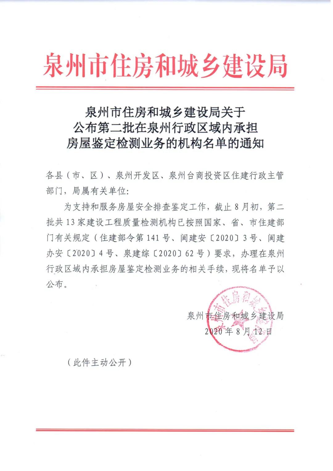 繼我司順利在福建省房屋結(jié)構(gòu)安全隱患大排查大整治百日攻堅(jiān)專項(xiàng)行動(dòng)中順利通過福建省住建廳的備案工作后,按照有關(guān)規(guī)定的要求,我司繼續(xù)申請(qǐng)辦理在泉州行政區(qū)域內(nèi)承擔(dān)房屋鑒定檢測(cè)業(yè)務(wù)的相關(guān)手續(xù),現(xiàn)已取得泉州市房屋安全鑒定檢測(cè)業(yè)務(wù)資質(zhì),可在泉州市開展房屋安全鑒定檢測(cè)工作。