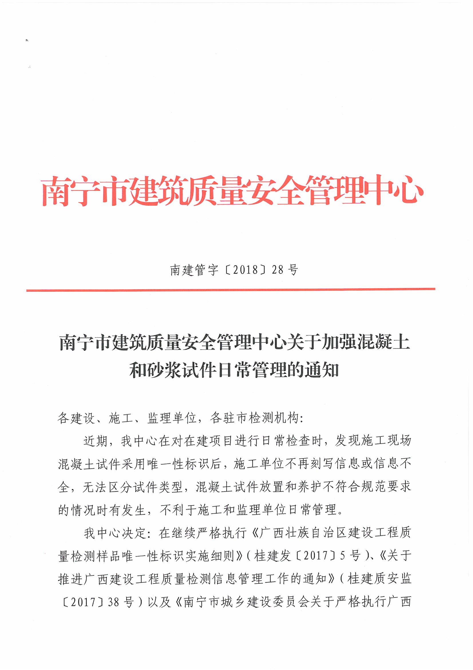 南寧市建筑質量安全管理中心關于加強混凝土和砂漿試件日常管理的通知